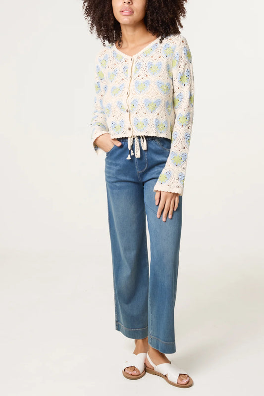 Beaded Heart Pattern Crochet Cardigan Blue
