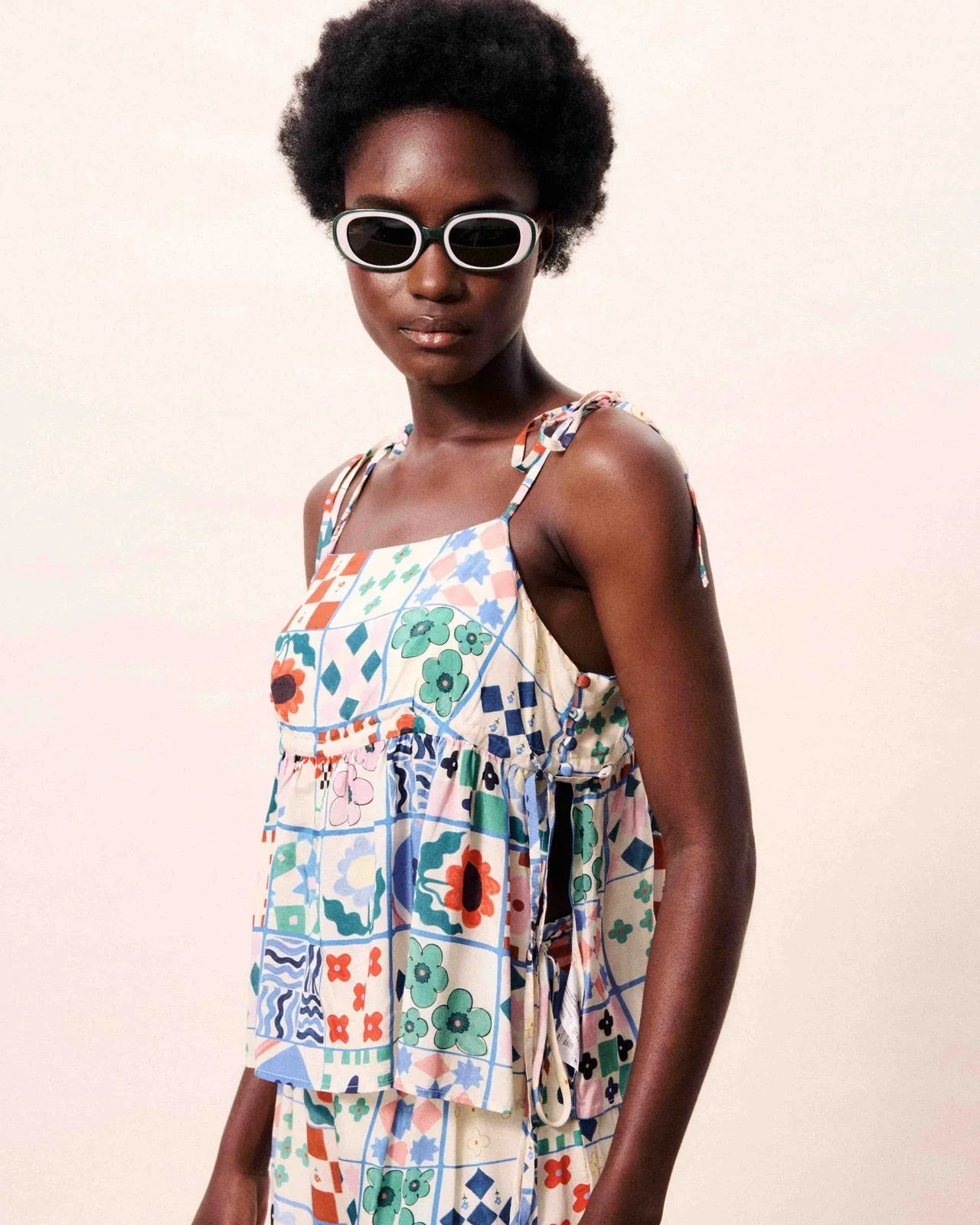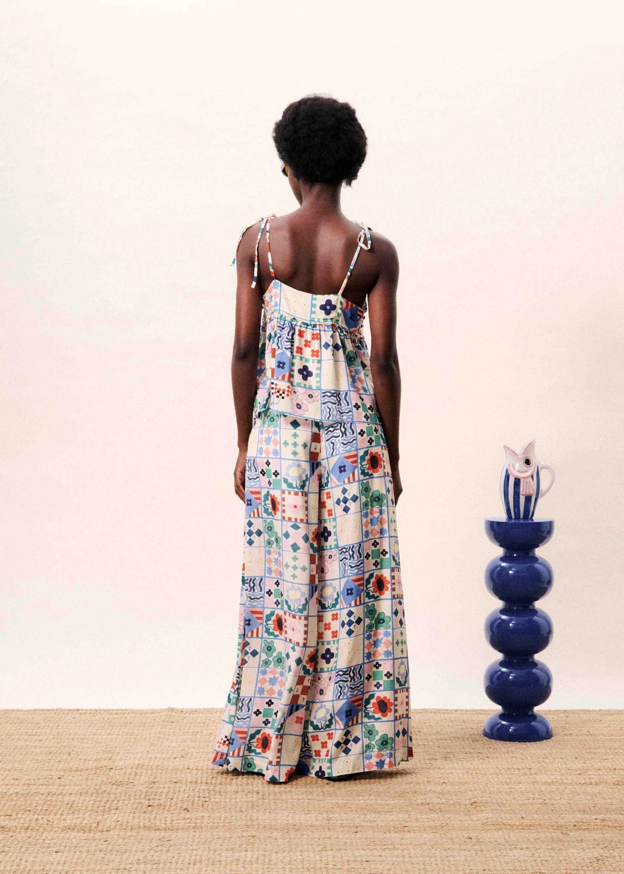 • Short dress with thin straps tied at the shoulders
