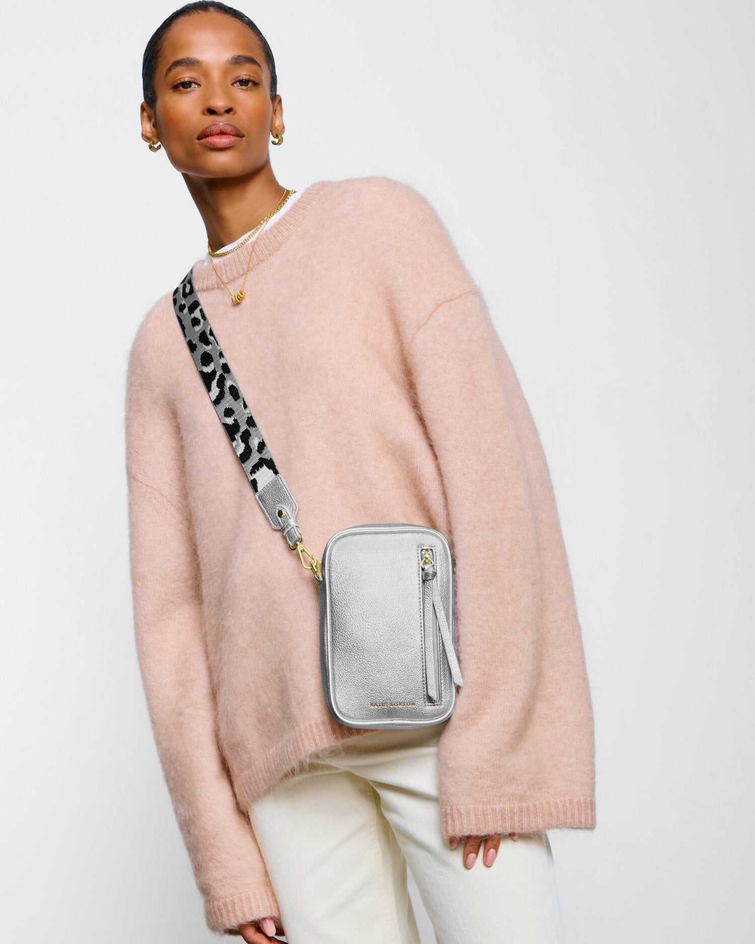 Our Hallie Small Crossbody Bag in Silver features a detachable canvas crossbody strap, allowing you to easily switch up your look with our available Interchangeable Bag Straps. The front zip pocket makes it the perfect everyday accessory for storing your small essentials, while the signature tassel detail coordinates effortlessly with the rest of the Hallie Collection.