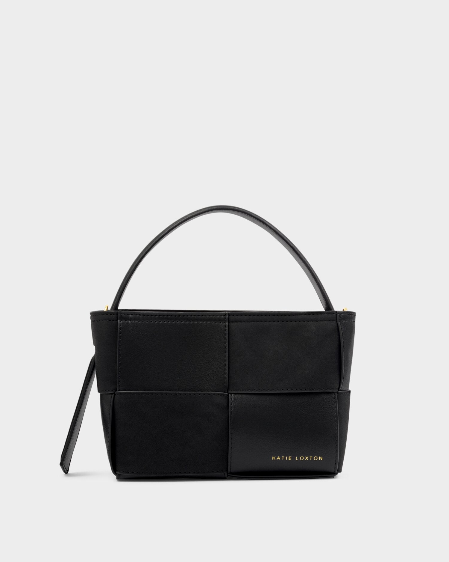 Our Taya Top Handle Bag in Black features a woven panel texture that adds a contemporary twist to a timeless silhouette, combining contrasting faux suede and vegan leather. Designed with an asymmetrical handle and a detachable crossbody strap for versatile styling, Taya is a standout piece for the season.