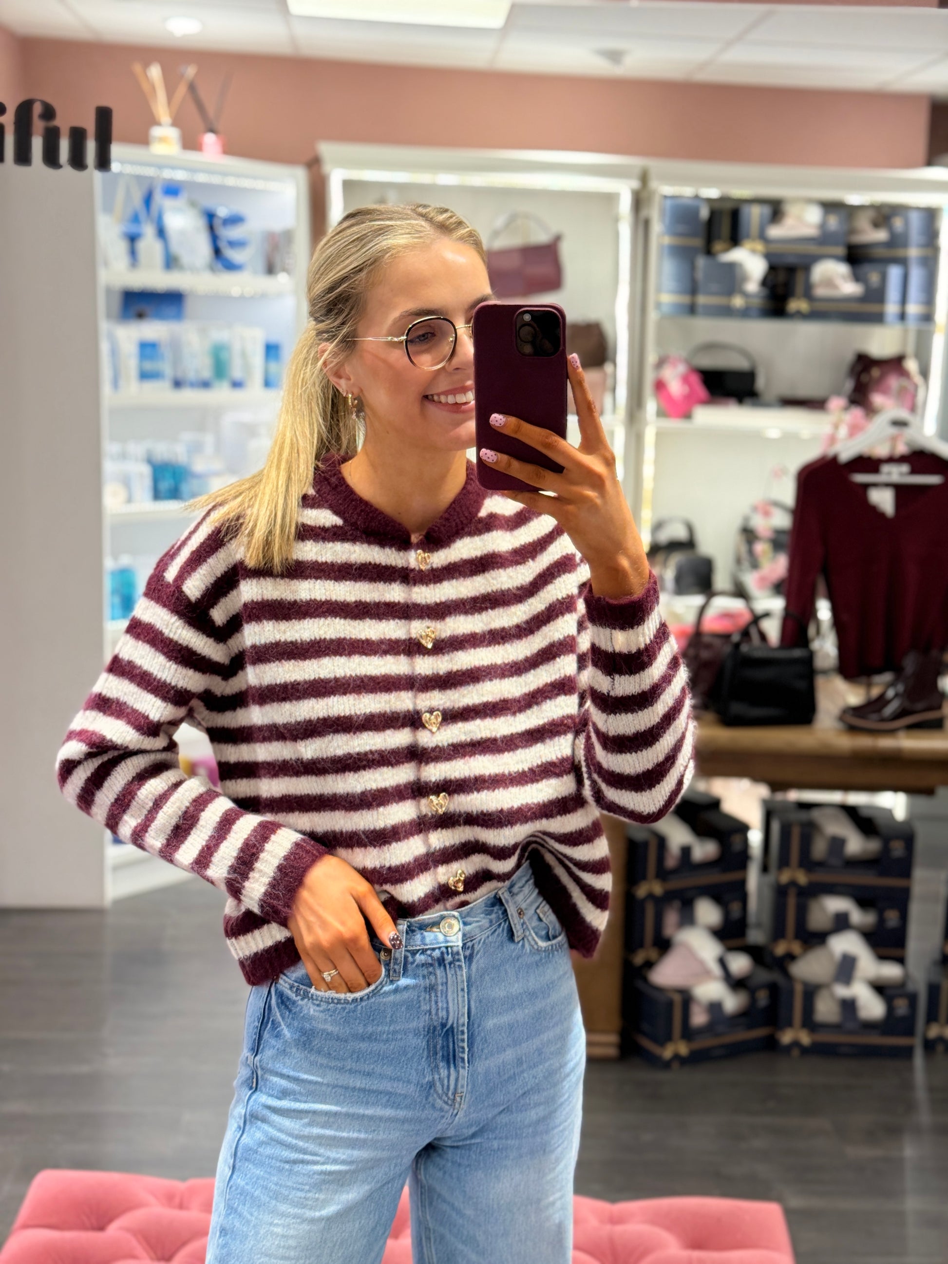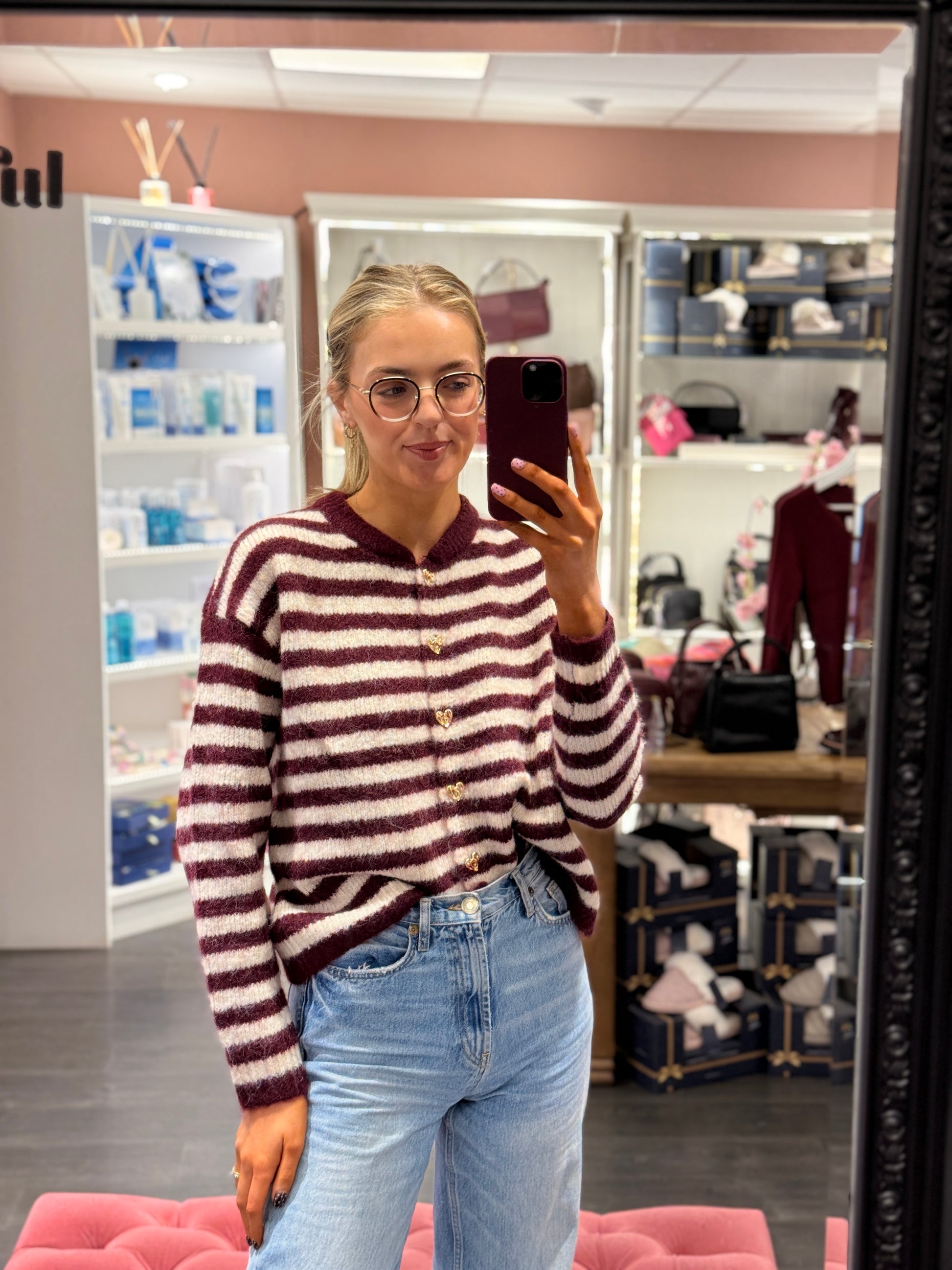 This new burgundy cardigan combines classic autumn tones with striking white and burgundy stripes for a refined look. Featuring elegant gold heart-shaped buttons, it adds a subtle touch of sophistication to your layering options. Designed for comfort and style, this piece is ideal for the season’s transitional wardrobe. A distinctive new arrival that enhances your outfit with expert craftsmanship and timeless appeal.