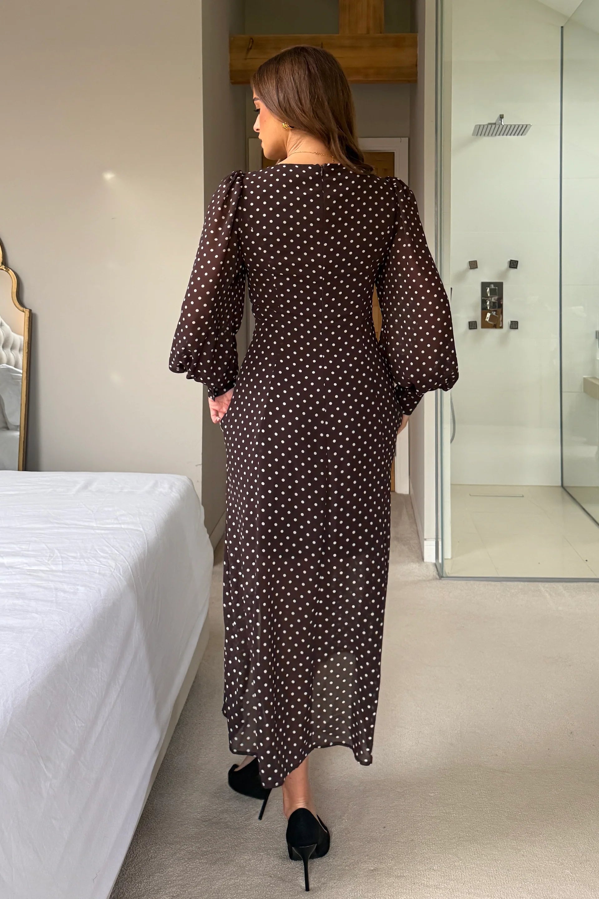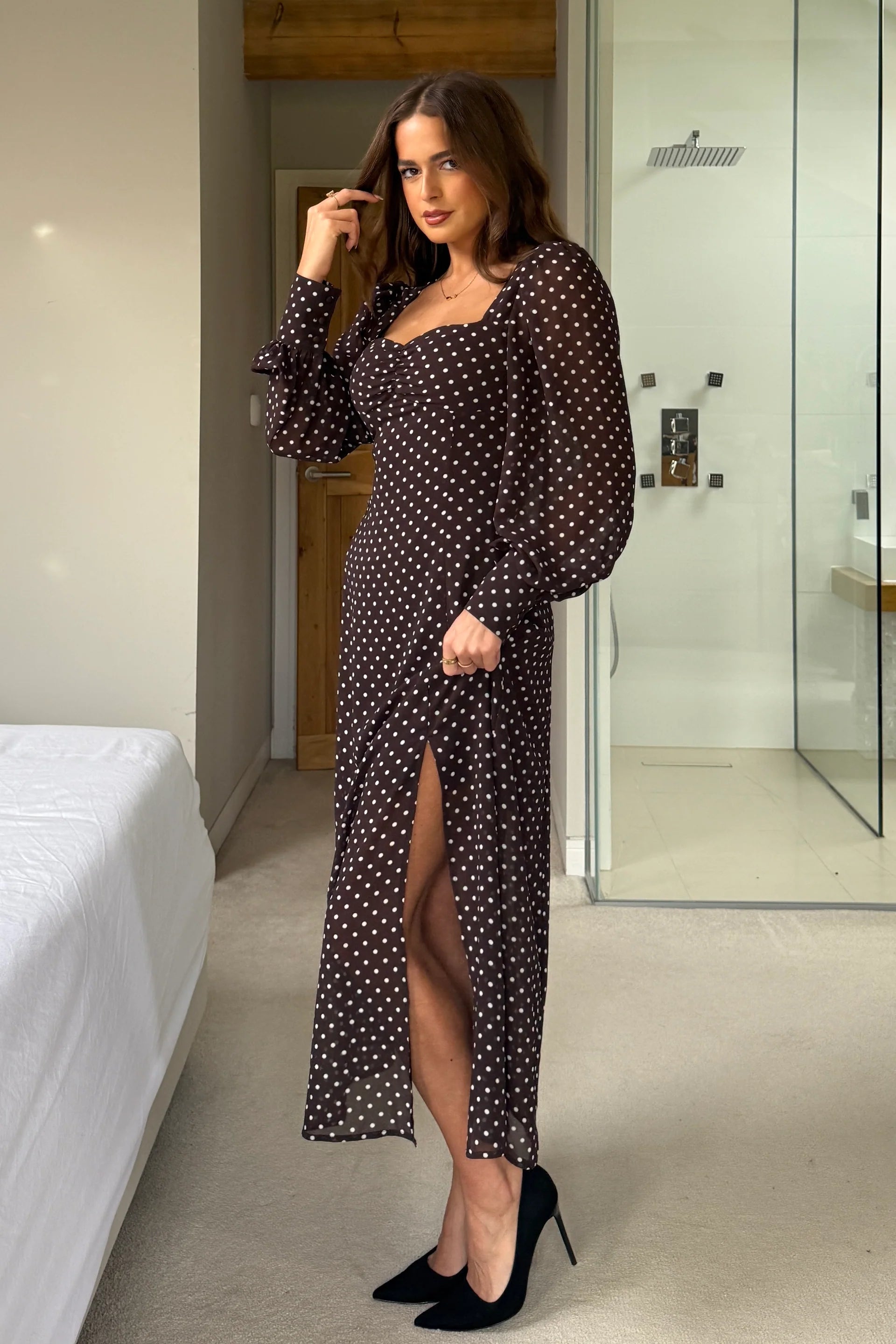 Olive Brown Polka Dot Sweetheart Long Sleeve Midi Dress